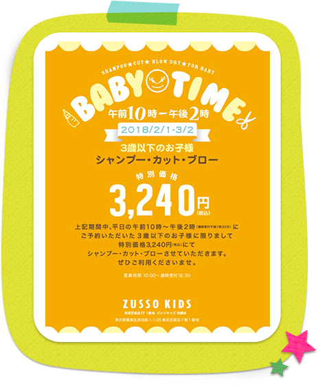 2018年7月10日から8月31日までの平日限定10時から14時まで(最終受付13時30分)にご予約いただいた3歳以下のお子様に通常¥4104(税込)が¥3780(税込)でご利用いただけます。 ズッソキッズ各店で行っています!(ご予約は2018/1/2から開始いたします。)